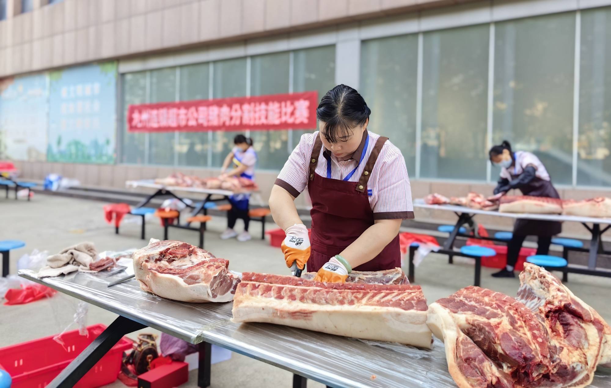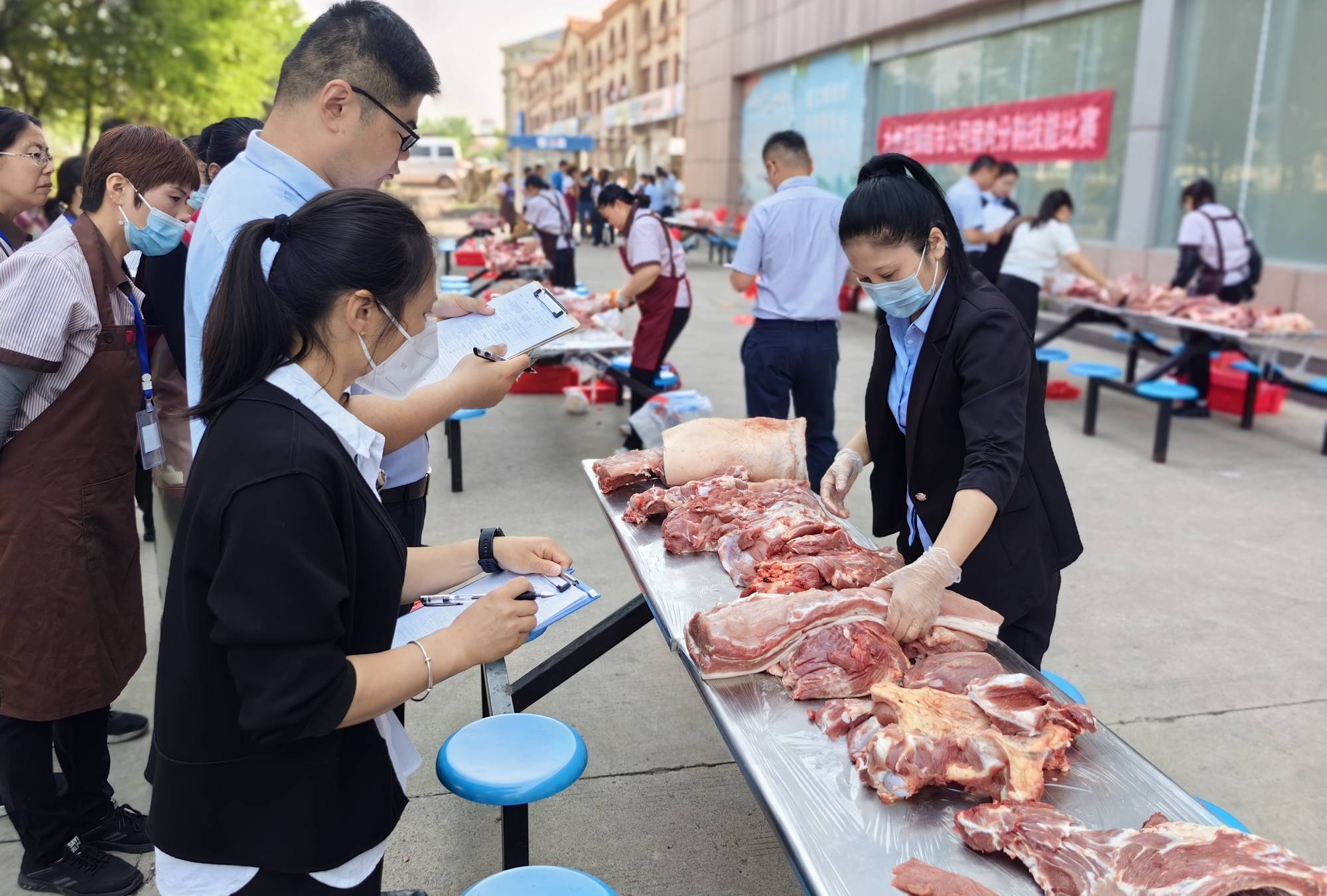 5月16日上午,超市公司在配送中心舉辦豬肉分割技能比賽,超市公司各門店共計(jì)34名員工參加。比賽現(xiàn)場,選手根據(jù)比賽要求在盡可能短的時(shí)間內(nèi)完成對白條豬的剔骨、分割,考驗(yàn)員工刀工操作的熟練程度和對商品重量的精準(zhǔn)把握。經(jīng)過綜合比拼,購物中心十里坊店沈繡芳獲得第一名,商城店徐坤獲得第二名,購物中心河?xùn)|店劉玉霞獲得第三名。