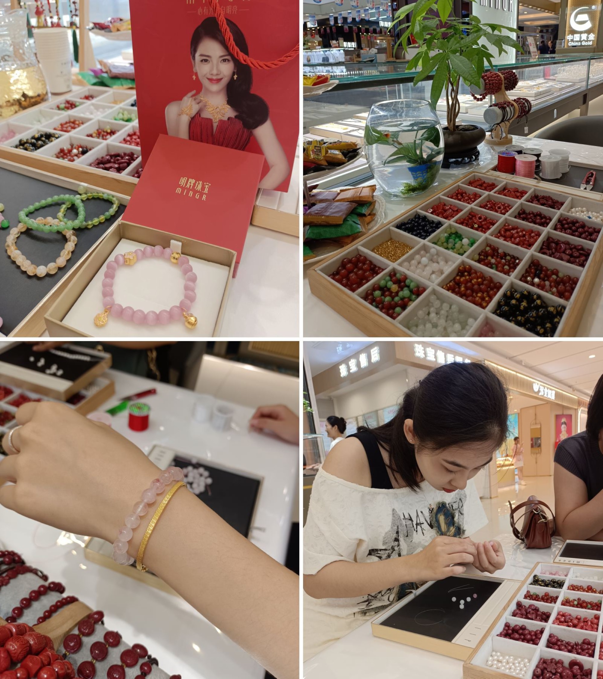 活動現(xiàn)場,專柜備有多樣串珠材料,顧客可按照喜好將串珠與黃金飾品巧妙搭配,碰撞出獨有的風(fēng)格。一件件獨具巧妙的作品完成后,顧客們紛紛拍照分享,對自己親手制作的作品愛不釋手。