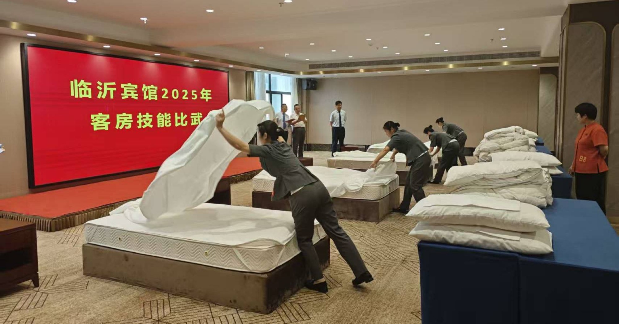 9月28日下午,臨沂賓館中式鋪床技能比武在沂蒙路店貴賓樓多功能廳舉行。本次技能比武分為中式鋪床、開夜床兩項,共有18名選手參加,以實操比拼展現(xiàn)服務專業(yè)素養(yǎng)。