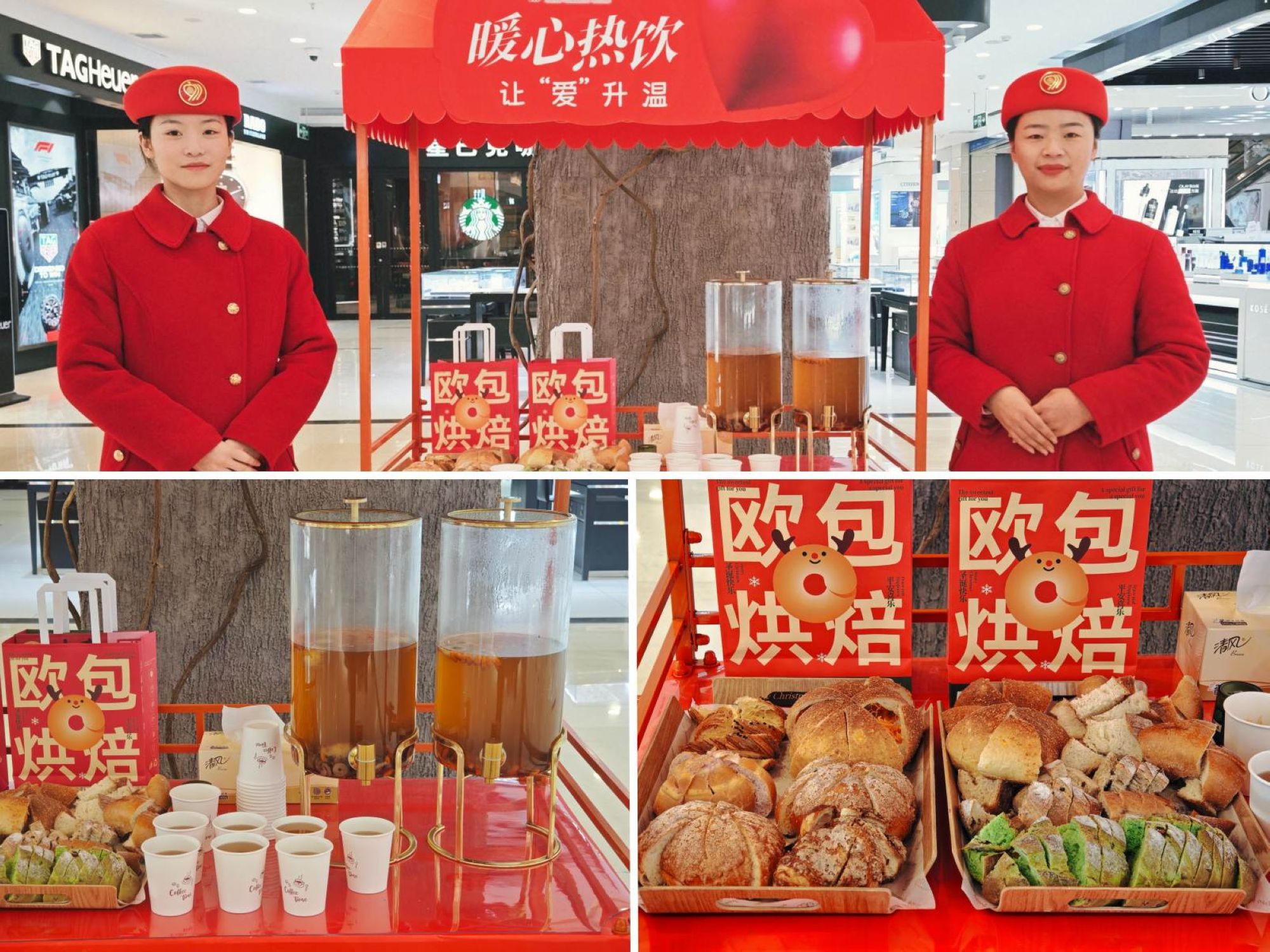 活動現(xiàn)場布置了以紅色為主題的暖心熱飲站,備有菊花去火茶、雪梨潤喉茶、生姜暖胃茶等熱飲,搭配歐包烘焙小面包供顧客免費(fèi)品嘗。工作人員面帶微笑,為往來顧客遞上一杯杯溫?zé)岬牟栾嫞岊櫩驮谫徫镏喔惺艿綄崒嵲谠诘年P(guān)懷,也讓九州商業(yè)大廈成為冬日里的“溫暖坐標(biāo)”,為顧客驅(qū)走冬日里的嚴(yán)寒冷意。